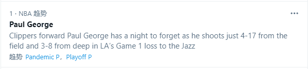 乔治投篮手感十分糟糕,堪称地狱般的表现,多次错失大空位三分球,虽然关键时刻投进三分,但他整场的表现太差,他是快船输球的一大罪人;赛后乔治、季后赛乔治等词汇冲上热搜,名嘴狠批乔治状态如字母哥。