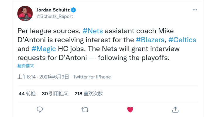 据Jordan Schultz报道,篮网将在今年季后赛之后允许别的球队对德安东尼的面试请求。目前篮网正在全力冲击总冠军,在哈登缺席的情况下,他们面对雄鹿仍然轻松取得2比0领先,尤其G2狂胜39分!现在的篮网毫无疑问是夺冠第一热门!因此有球迷认为德安东尼留在篮网当助教或许也是不错的选择,毕竟像篮网这样的满级号是可遇不可求的!