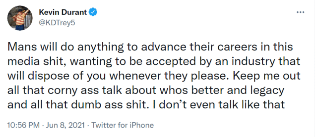 在评论区否认还不够,杜兰特转发了美媒相关报道后,继续在社媒上发帖写道:“人们会不惜一切在这个媒体垃圾行业中发展他们的事业,希望被接受。让我远离那些关于谁更出色等愚蠢话题,我甚至不会像那样说话。”
