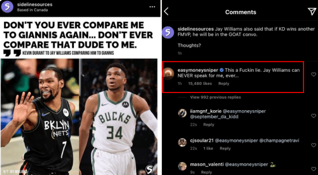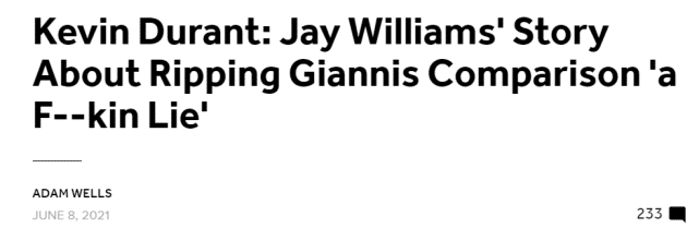 在一档节目上,杰-威廉姆斯谈到了他和杜兰特之间的一件往事。据威廉姆斯讲述,几年前,他和杜兰特在一次聚会上聊天,当时他把杜兰特和字母哥进行一番对比,杜兰特听到后情绪激动,说了这样一番话:“别拿扬尼斯(字母哥)跟我比,别把那个家伙拿来跟我比。”