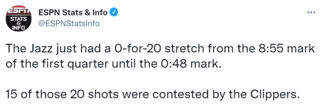 连续20次出手不中,实在罕见。ESPN晒出了爵士连续20投不中的投篮图,其中14次出手在三分线外。ESPN还表示,20次出手中,有15次出手是在快船防守下投出的。快船的防守表现还是很出色的。