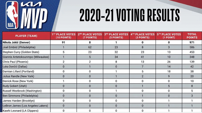 来源:24直播网06-09 15:4024直播网讯 北京时间6月9日,NBA公布了本赛季常规赛MVP得主,掘金中锋约基奇当选,他也是历史上第一个二轮秀的MVP,他是以第41顺位进入到联盟的。同时约基奇也是掘金历史上的第一MVP,奥尼尔之后第一位中锋MVP等等一系列的荣誉都属于约基奇。在选票层面,约基奇拿到100张第一选票中的91张,总分971分。恩比德、库里、字母哥、保罗和东契奇分居第2-6名,詹姆斯连续18年获得MVP选票。
