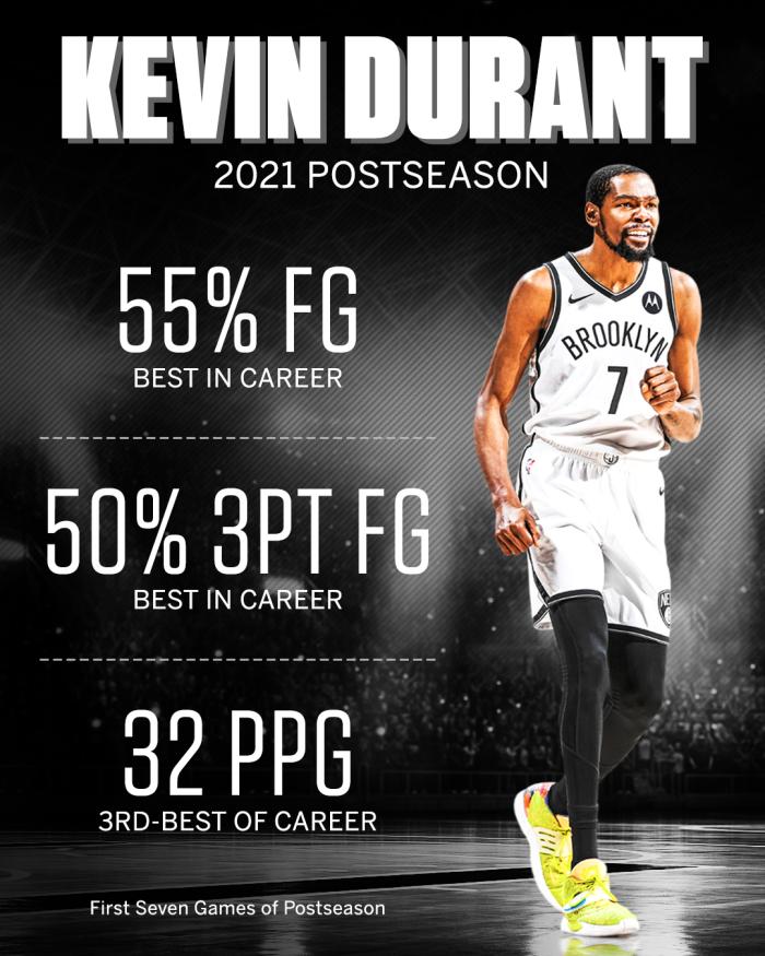 季后赛至今,杜兰特一共出战七场比赛,场均狂砍32.0分7.3篮板3.4助攻2盖帽1.3抢断,投篮命中率55%,三分命中率50%,罚球命中率91.1%;季后赛生涯前7场比赛,杜兰特投篮命中率和三分命中率都创生涯新高,场均得分是生涯第三高。