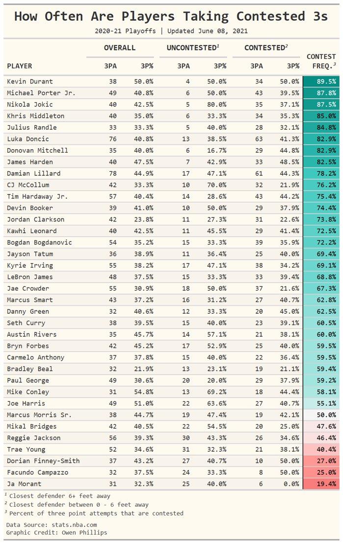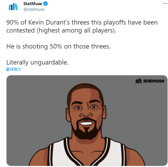 据统计,季后赛至今,杜兰特面对防守的三分出手比例达到89.5%,是所有参加季后赛球员中最高。杜兰特已经出手38次三分,其中有34次是顶着防守强投的,并且面对防守的三分命中率高达50%。