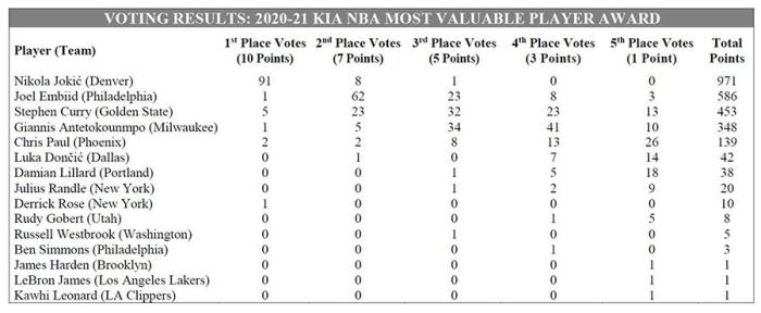 约基奇获得91张第一选票、8张第二选票、1张第三选票,总共获得108张选票,总得分971分;恩比德仅获得1张第一选票,总得分586分;库里5张第一选票,获得453分。