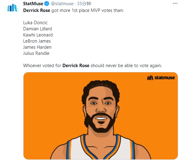 美媒StatMuse发推写道:罗斯获得第一选票,比詹姆斯、哈登、小卡、利拉德、东契奇以及兰德尔还多,无论是谁投给了罗斯,都不应该再投了。