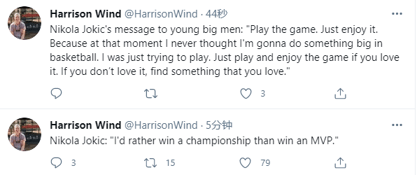 与此同时,约基奇也鼓励年轻人:打比赛,好好享受吧!因为我从没想过我会在篮球上做大事,我只是想打篮球;如果你喜欢,就尽情地玩吧;如果你不喜欢它,找一些你喜欢的东西。