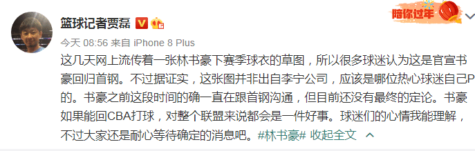 “这几天网上流传了一张林书豪下赛季球衣的草图,很多球迷认为这是官宣书豪回归首钢。不过据证实,这张图并不是来自某体育公司,应该是球迷P的”。贾磊等于是回应了传言,也就是说,书豪回归首钢的消息,现在并没有官方的证实。