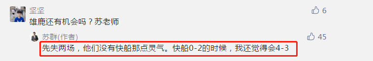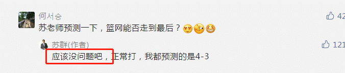 而苏群老师还回应了篮网是否能走到最后夺冠的话题,在苏老师看来,冠军应该是篮网的了。有球迷提问,“苏老师预测一下,篮网能走到最后吗”,而苏群老师表示,应该没问题,正常打,预测的都是4-3。