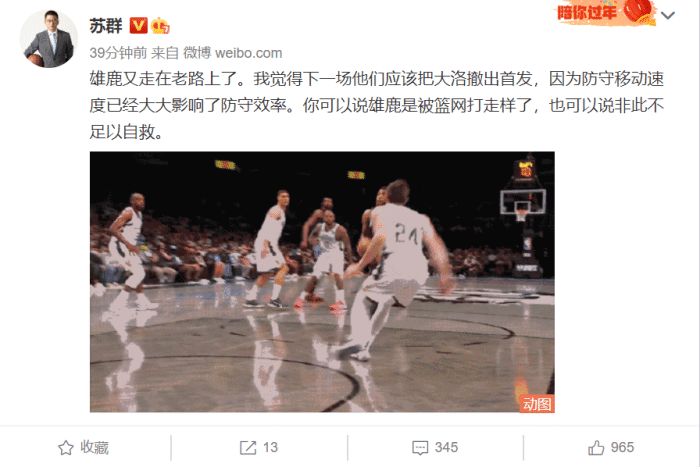 国内名嘴苏群、王猛等人也纷纷感叹篮网实力的强大,并表示这是一场“屠杀”苏群建议雄鹿把大洛撤下首发,因为他在防守端脚步移动缓慢太吃亏,面对杜兰特和欧文的换防单打无计可施,难道让他们改打小个阵容?可能也未必是好结果,但G3他们一定会做出调整的!