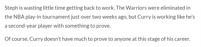 上赛季,库里赢下了生涯第二个得分王头衔,场均32分,投篮命中率48.2%,三分命中率42.1%,他的真实命中率达到65.5%,是生涯至今第三高的表现。在下赛季开始前,库里会有更多的队友加入训练中,汤普森预计在10月下旬能恢复健康,怀斯曼将为训练营做好准备。美媒认为,看到当家球星这么努力,勇士的不少球员预计都会很快回到训练场,开始备战新赛季。