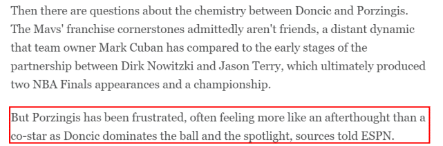 来源:24直播网06-08 15:5024直播网讯 北京时间6月8日,ESPN名记蒂姆-麦克马洪报道称,波尔津吉斯(波津)对自己在独行侠扮演的角色感到失望。“独行侠老板库班曾把东契奇和波尔津吉斯的关系,描述为早期的诺维茨基和特里,两人最终率队两次打进总决赛,并夺得一次总冠军。但波津觉得自己只是个配角,认为东契奇拿走了所有的球权和关注。”麦克马洪在文中写道。