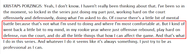 这不是麦克马洪的推测,从独行侠被淘汰后的波津的采访中,你也能感受到他的不满。当时,波尔津吉斯说:“我在心态上确实有一些波动,因为这不是我习惯做的事情,也不是令我感到最舒服的状态。这有点让我想到我的新秀赛季。那时我的工作就是抢前场篮板,努力做好防守,折返跑,然后做所有能影响比赛的小事。这就是我在这个系列赛里做的事情。我尽可能地保持职业。”