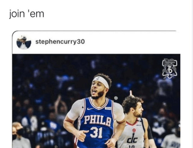 美媒随后晒出了费城篮球运营总裁违规的证据。当时勇士球星库里晒出了一张弟弟塞斯-库里的照片,称赞他表现不错。当时,塞斯-库里对奇才一战中创下季后赛生涯得分新高。而费城运营总裁转发了斯蒂芬-库里的社媒,并配上了两个单词:“Join them(加入他们)”。