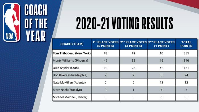 从投票结果来看,锡伯杜获得43张第一选票、42张第二选票和10张第三选票,总共获得351分,险胜蒙蒂-威廉姆斯夺得最佳主教练,蒙蒂-威廉姆斯获得45张第一选票,但总得分340分,比锡伯杜少11分,从而遗憾无缘最佳主帅。