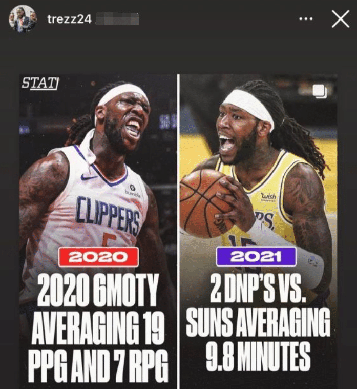 哈雷尔湖人被淘汰出局之后,在社交媒体上宣泄自己的不满。他晒出了一张上赛季和本赛季的对比照,内容中写道:2020年场均19分7板,2021年面对太阳2次被DNP场均9.8分钟。很显然,哈雷尔用这样的一张图表达了自己强烈的不满,炮轰球队不给他时间表现。