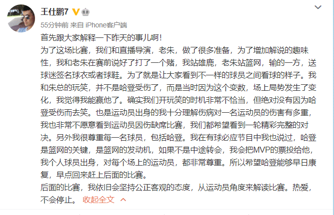 王仕鹏解释道:“为了增加解说的趣味性,我和老朱在赛前说好了打了一个赌,我站雄鹿,老朱站篮网,输的一方,送球迷签名球衣或者球鞋。为了就是让大家看到不一样的球员之间看球的样子。我和朱总的玩笑,并不是哈登受伤了,而是当时因为这个变数,场上局势发生了变化,我觉得我能赢他了。确实我们开玩笑的时机非常不恰当,但绝对没有因为哈登受伤而去笑。”