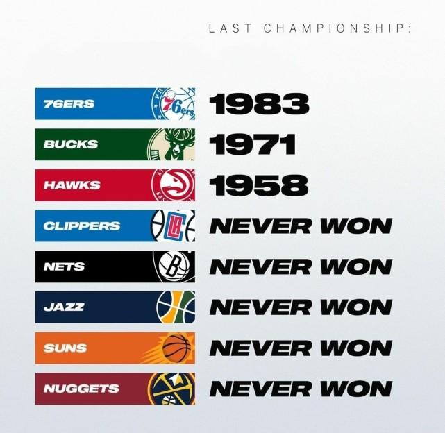 来源:24直播网06-07 15:1024直播网讯 北京时间6月7日,随着快船击败独行侠,本赛季的八强已经全部产生。他们是东部的费城、篮网、雄鹿、老鹰,西部的爵士、太阳、快船和掘金。美媒很快回顾了八支球队上一次夺冠的时间,其中竟有五支球队在队史上从未夺冠。而其他三支球队,最近的一次夺冠也要追溯到1983年,也就是38年前。