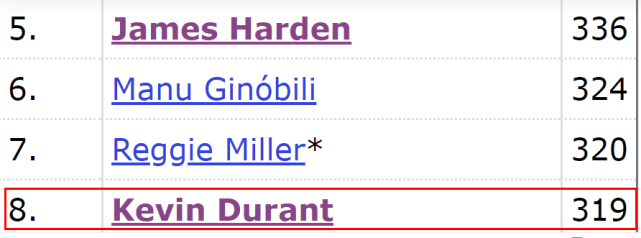第一,杜兰特的季后赛生涯三分命中数已经达到319球,目前排名历史第8位。排名第7的雷吉-米勒累计命中320个三分,排名第6的吉诺比利累计命中324个三分。杜兰特有望冲到第7,手感要是足够好,还有希望冲击第6。本赛季常规赛,杜兰特场均命中2.4个三分球,季后赛,场均命中2.5个三分球。