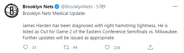 篮网官宣检查结果!哈登伤情确诊确定缺席G2,发推回应感谢詹姆斯