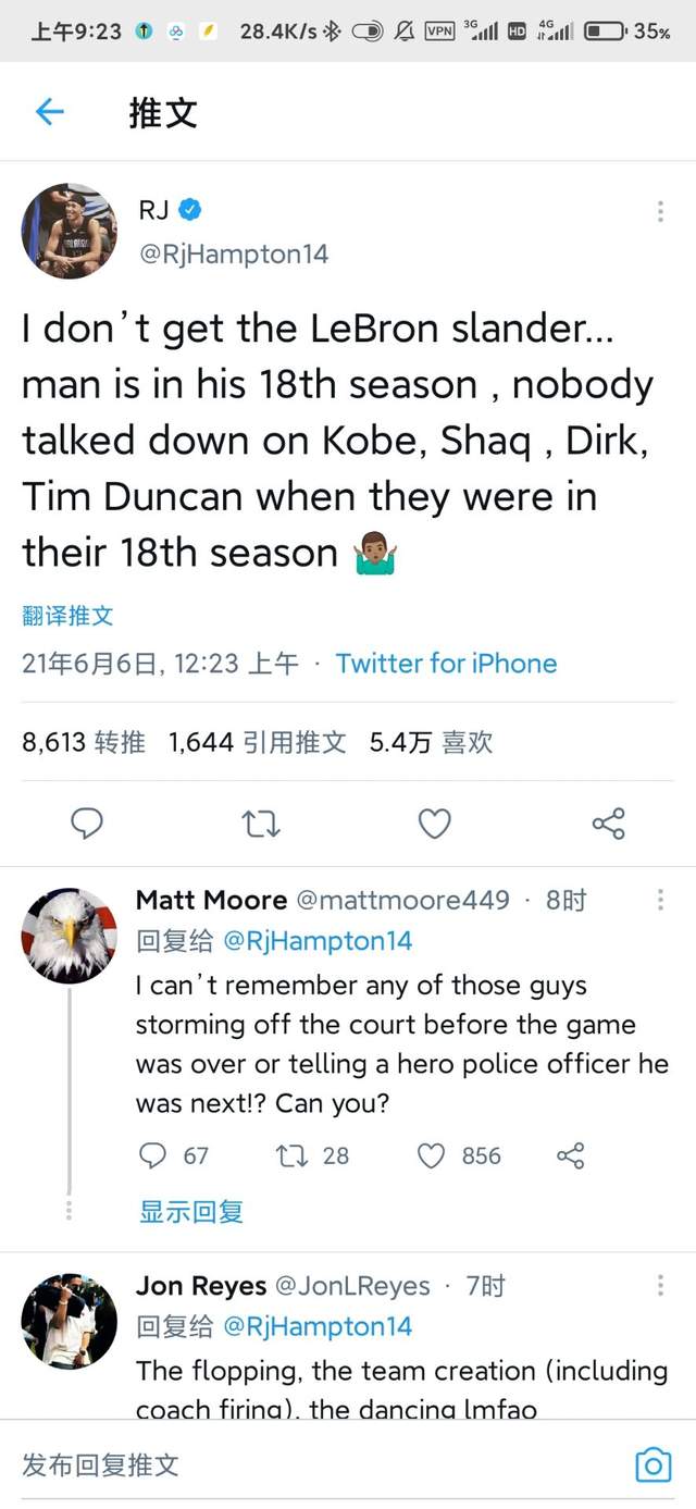 可能这种伟大是很多球迷感受不到的,但那些在NBA中打球的球员,他们能够看到詹姆斯的伟大,因为他们站在一个职业球员角度,所以才能看到作为球员的詹姆斯有多么伟大。而魔术队的球员RJ汉普顿今天在推特上谈到詹姆斯的境况,他对于詹姆斯被舆论攻击感到不理解,并对詹姆斯给予了尊重。