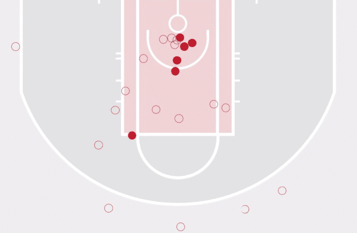 众所周知,米德尔顿进攻打法更多偏向于投射,不过此役可以看到,米德尔顿中距离和三分几乎全部打铁!6个进球有5个是来自篮下这片区域,外线投射只进了一个中距离。作为对比,首轮季后赛三分命中率只有6%的字母哥今天还投进了两记三分!