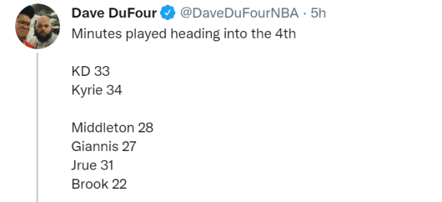 有记者晒出前三节打完时,两队主要球员的上场时间对比。篮网的杜兰特33分钟,欧文34分钟;雄鹿的米德尔顿28分钟,字母哥27分钟,霍乐迪31分钟,洛佩斯22分钟。