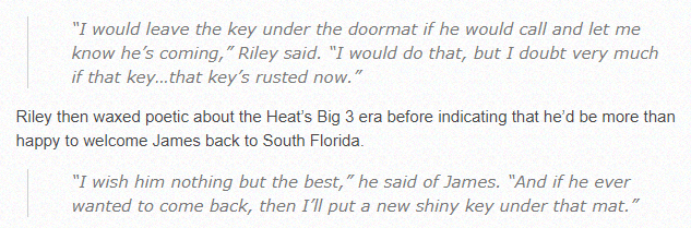 76岁莱利表示:如果詹姆斯打电话告诉我他想回来,我会把钥匙放在门口的垫子下面,但我很怀疑那把钥匙已经生锈了;我只希望他一切顺利,如果他想要回来的话,我会把一把新钥匙放在门垫下。