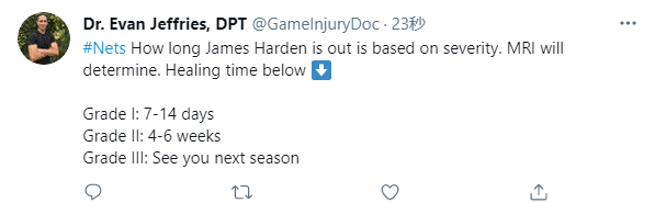 首轮打了5场比赛,哈登场均上场36.4分钟能够拿到27.8分10.6助攻7.2篮板2次抢断1盖帽;可第二轮仅打43秒就受伤退赛,究竟哈登会伤停多久?核磁检查结果将会给出结果,据医学专家报道,哈登伤势伤停情况是一级拉伤至少伤停7-14天,二级拉伤至少伤停4-6周以及三级拉伤直接赛季报销。