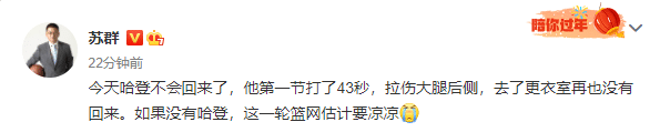 国内名嘴苏群更新动态,写道:今天哈登不会回来了,他第一节打了43秒,拉伤大腿后侧,去了更衣室再也没有回来。如果没有哈登,这一轮篮网估计要凉凉。