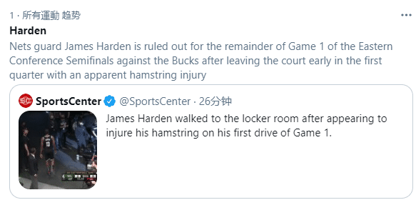 首节比赛刚开场,哈登持球突破组织进攻,落地时哈登捂着大腿十分痛苦,随后哈登沮丧离场,直接返回更衣室接受检查,伤情确诊为右腿筋拉伤,本场比赛不会回归。