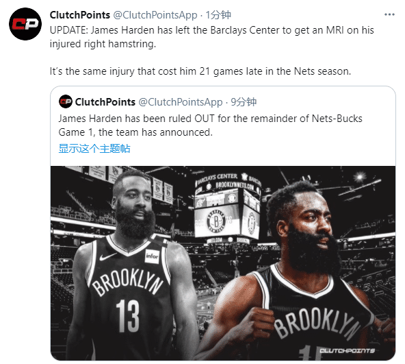 目前哈登已经离开巴克莱中心球馆,前往医院做核磁共振的检查,预计很快篮网将会宣布哈登伤势的严重程度;但愿哈登伤势无大碍。