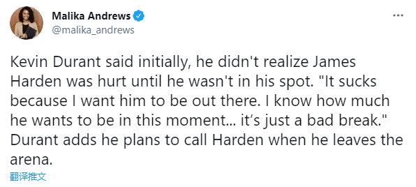 赛后谈到哈登伤情,杜兰特爆粗表示:这特么太糟糕,我想让他在场。我知道他此刻有多想打比赛,希望他早日康复,这太糟糕了;杜兰特还表示他计划在离开赛场后给哈登打电话,安慰并问候哈登。