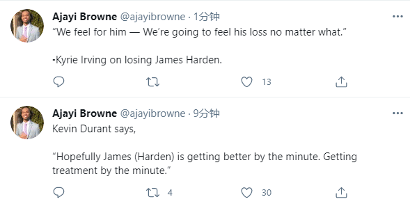 欧文则是表示我们为哈登受伤而难过,无论如何,我们都能感受到他的失落。