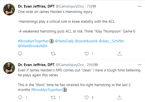 医学专家Evan Jeffries发推写道:即使哈登的核磁检查结果无大碍,他也很难继续出战这个系列赛,这是哈登在过去两个月第三次拉伤腿筋;腿筋对膝关节十字韧带的稳定性起着关键的作用,腿筋拉伤让前交叉十字韧带处于危险之中,想想总决赛G6的克莱-汤普森吧。