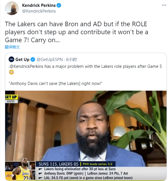 湖人G5天王山惨败太阳30分,系列赛2-3落后已经陷入绝境——G6赢或者回家;G6仅靠詹姆斯和浓眉能赢球吗?名嘴帕金斯明确表示,浓眉无法拯救湖人,詹姆斯和浓眉也不能拯救湖人,除非湖人角色球员挺身而出,否则系列赛就不会有抢七大战了。