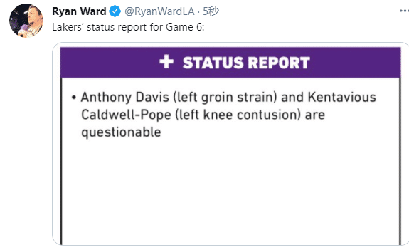 湖人两大主力G6出战成疑,预计浓眉和波普都会带伤出战,毕竟是系列赛生死战——赢或者回家,这就是湖人的处境,他们必要抱着必赢的心态,打出该有的样子;说实在的,天王山一战溃不成军,湖人打得太烂太糟糕。