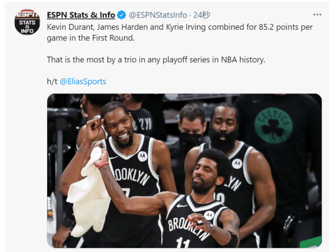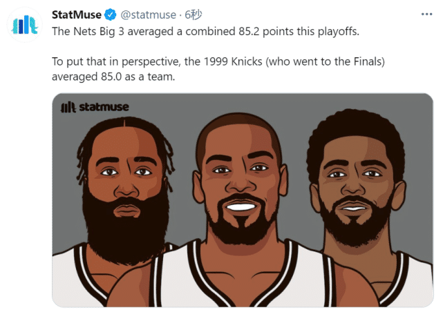 与绿军的首轮系列赛,篮网三巨头展现了他们恐怖的进攻天赋,系列赛G3,三巨头合砍96分、系列赛G4,三巨头一度合砍104分!据美国媒体统计,篮网三巨头季后赛首轮场均合砍85.2分,创NBA历史三人组单轮系列赛得分纪录。仅次于三巨头的,是1999年的纽约尼克斯,后者球队三巨头曾场均85.0分,最终打进了总决赛。