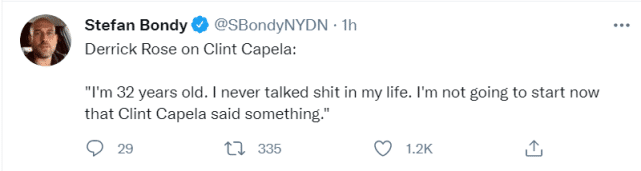 在尼克斯球员眼中,卡佩拉的这番话无疑是挑衅。兰德尔的回应是“我不在乎”,巴雷特的回应是“让我们拭目以待(G5)会发生些什么。”罗斯最有趣,他说:“我已经32岁了,我从来没说过什么垃圾话,我也不想因为卡佩拉说了些什么就开喷(垃圾话),我年纪太大了,喷不动了。”