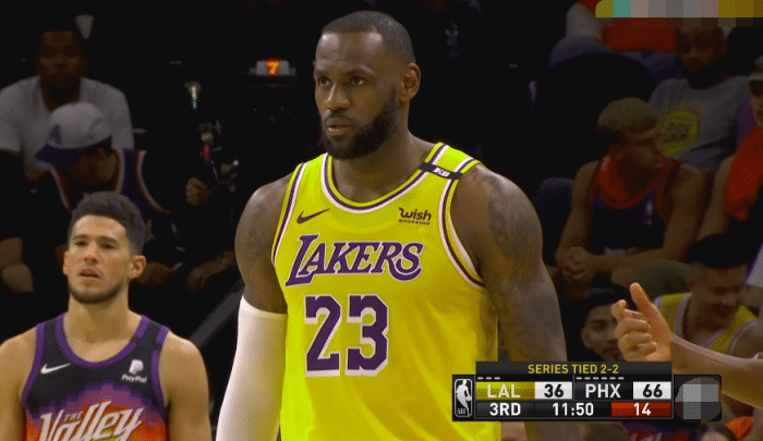 下半场的比赛湖人继续变阵,小加索尔和卡鲁索首发出场,布克跳投命中,小加索尔三分回应,克劳德三分命中,詹姆斯三分回应,施罗德连续投射不中,7次出手0命中,布里奇斯三分再中,分差再来到了32分,詹姆斯送妙传,施罗德空切上篮被帽,布克中投再中,湖人暂停,杨毅老师在解说的时候说道:施罗德这一战,把自己的身价打没了。对于湖人来说更为糟糕的是波普因左膝挫伤退赛,本场比赛不会回归。
