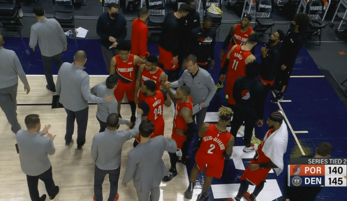 第二个加时,两队依旧是打得难舍难分,小波特三分命中,掘金取得了3分的领先,生死时刻麦科勒姆踩线失误,莫里斯两罚全中,麦科勒姆三分不中,比赛结束掘金145:140战胜开拓者。利拉德24投17中轰下55分(12记三分球),掘金这边约基奇38分11板9助。考文顿和CJ表现不佳,关键时刻考文顿扣飞,CJ踩线,有球迷调侃道:考文顿和CJ找个厂上班吧,可惜了利指导。