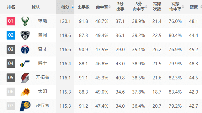 两支球队的进攻能力都是联盟顶级的,常规赛雄鹿场均得分120.1分,稳居联盟第一;篮网场均118.6分,联盟第二名;篮网投篮命中率49.4%联盟第一,雄鹿高达48.7%联盟第三;这两支球队都有出色的攻击手,他们在赛场上的对攻大战一定非常精彩。