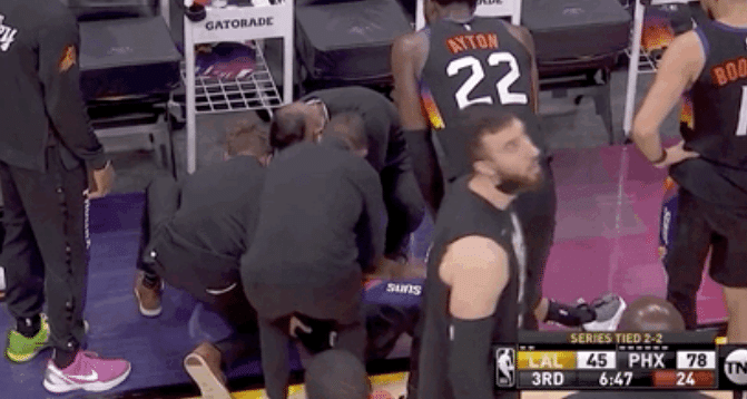 来源:24直播网06-02 15:1024直播网讯今天湖人和太阳的天王山之战在凤凰城上演,太阳主场作战,浓眉哥因伤缺阵,大莫里斯进入到首发,波普复出。比赛初期詹姆斯展现出了强势的一面,不过布克单节轰下18分,带领太阳单节反超8分。次节太阳更是在5分多钟的时间里轰出14-1的攻击波,在保罗、佩恩爆发,包括克劳德三分都进的情况下优势扩大,半场分差拉大到30分。下半场马修斯对保罗犯规,后者捂着肩膀去到场边,随后倒地不起,他非常难受。