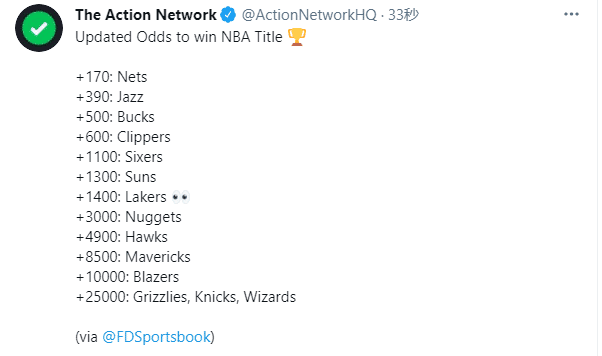 篮网赔率+170排在第一位、爵士+390排名第二、雄鹿+500排名第三、快船+600排名第四以及费城+1100排在第五位。