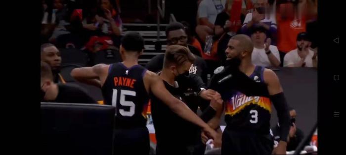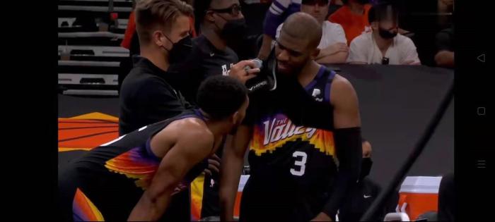 在返回更衣室的时候,保罗满脸的沮丧,或许那时候的保罗认为自己的伤情可能会影响到下一场比赛,可是在比赛第四节,当接受完治疗的保罗重新返回场边的时候,他的情绪好转了许多,甚至保罗还会拉住刚刚下场的队友进行一番指导,从保罗的情绪变化和反应来看,这次受伤并没有对于保罗有太大的影响,这次意外也不足以阻止保罗出现在系列赛G6当中。