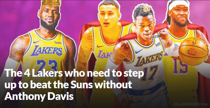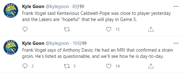 湖人G5伤情报告显示浓眉(腹股沟拉伤)出战成疑,预计波普能够出战,浓眉受伤或逼出全力詹,但美媒认为在没有浓眉的情况下,湖人需要4名球员挺身而出才能赢球——詹姆斯、施罗德、库兹马和哈雷尔;36岁詹姆斯依旧能打出统治力,不过考虑到他的年龄以及脚踝问题,湖人需要施罗德、哈雷尔以及库兹马站出来。