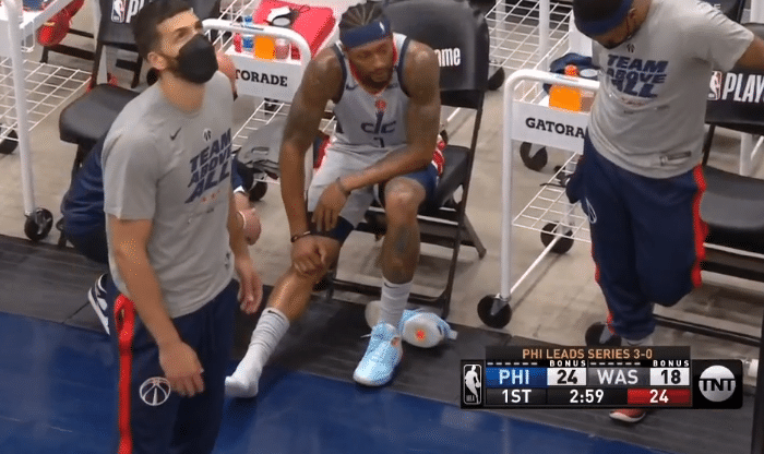 首节还剩2分多钟,在没有任何接触的情况下,比尔的球鞋掉了,疑似扭伤膝盖,当时比尔一瘸一拐走回替补席,奇才队医为他检查膝盖,所幸伤势无大碍,第二节继续上场。