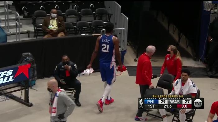 恩比德伤退!摔伤背部沮丧离场后因伤退赛,一直留在更衣室接受治疗