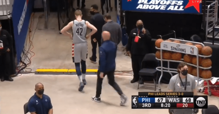 在奇才主场,比赛正在进行时,突然有球迷冲进球场,直接被安保制服并被警察带走,离场时这球迷还继续闹事;季后赛至今,NBA已经发生多起恶劣事件,此前威少被扔爆米花、特雷杨被尼克斯球迷吐痰、欧文被绿军球迷扔水瓶以及莫兰特家人被辱骂,这些惹事球迷都被永久禁赛。