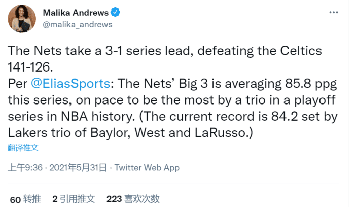而据记者malika报道,篮网凯尔特人系列赛打到现在,篮网三巨头场均可以合砍85.8分!NBA历史上三人组在单个系列赛中场均最高得分是84.2分,由湖人队的贝勒、韦斯特、鲁迪拉鲁索保持!杜兰特、哈登、欧文完全有可能创造新的历史!